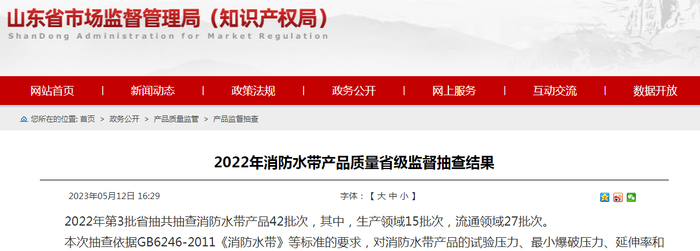 2022年山东省消防水带产品质量省级监督抽查结果