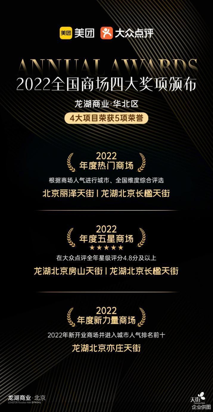 持续的私域、公域互动成效显著,在美团和大众点评发布的2022年全国商场评选中,仅龙湖商业华北区域就有4个项目,斩获年度热门商场、年度五星商场、年度新力量商场等5项荣誉。