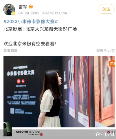 五一期间,在微博上拥有3.9万粉丝的北京大兴天街,就与小米掌门人雷军频频互动,为2023年小米徕卡影像大赛吸引更多关注流量。