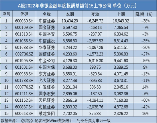 近期,券商降薪的传闻此起彼伏,这也从年报薪酬数据上得到了验证。中信证券高管年度薪酬总额从上年的1.66亿元降至1.04亿元,同比下滑38%。中金公司从上年的9441.6万元降至4126.3万元,降幅达56%。除了中金公司,还有东兴证券、兴业证券、天风证券、长城证券、申万宏源的高管总薪酬“腰斩”。