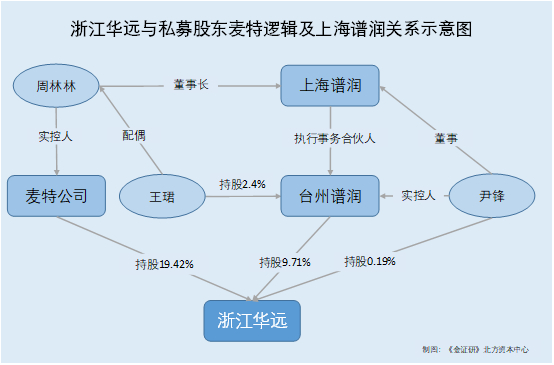 可以看出,周林林与尹锋分别是两大私募股东麦特公司与台州谱润的实控人,且二人同在台州谱润的执行事务合伙人处任董事长和董事。换言之,两大私募股东麦特公司和台州谱润,系关联方,二者及台州谱润的实控人尹锋合计持有浙江华远股权的29.33%。