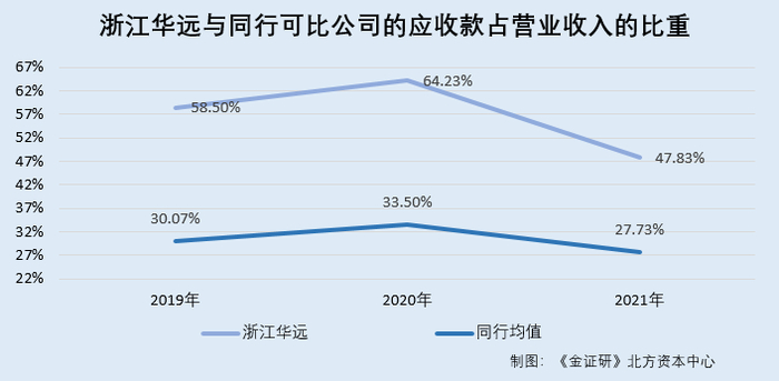 根据《金证研》北方资本中心测算,2019-2021年,浙江华远的应收票据、应收账款及应收款项融资(以下简称“应收款”)占当期营业收入的比重分别为58.5%、64.23%、47.83%,同行可比公司的应收款占营业收入比重的均值分别为30.07%、33.5%、27.73%。
