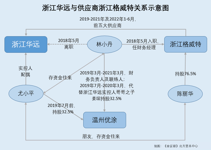 有意思的是,浙江华远实控人的配偶尤小平与浙江格威特的实控人系朋友,还存在资金往来。除此之外,浙江格威特成立的当月,即2018年5月,浙江华远的员工林小丹即入职浙江格威特,并开始担任财务经理。另一方面,2019年3月至2021年3月,林小丹在浙江华远实控人配偶尤小平控制的企业温州优涂,任财务负责人及联络人。不止于此,2019年7月至2020年3月,林小丹还代替浙江华远实控人哥哥之子姜琛持股。而2020年,林小丹与尤小平还存在资金往来。