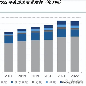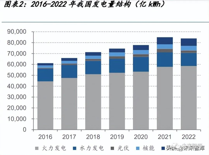 火力发电碳排放量仍呈现逐年上涨态势。近五年火力发电量占比逐年下降,从 2017 年的 72%下降到 2021 年的 71%,但是因为社会总用电量不断上升,火力发电的绝对数 值仍然持续增加,从 2017 年的 4.8 万亿 kWh 增加到 2021 年的 5.8 万亿 kWh,进而带 来的碳排放量的增长,减碳形势不容乐观。