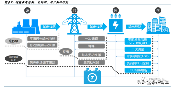 电源侧:1)平滑、调峰作用:由于光伏、风电、水电的随机性、波动性特征, 电源侧需要储能以实现电力从秒级到季度的供需平衡;2)黑启动:借助储能电 量带动无自启动能力发电机组。