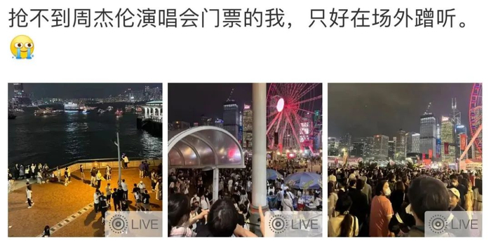 5月5日至5月14日期间,周杰伦在中国香港中环海滨活动空间举办演唱会,7场演唱会共14万张门票瞬间“秒空”,创下该场地个人演唱会最多观众记录。除了场内2万人的位置座无虚席,场外还有8万人在草坪上、游轮上、码头边“蹭听”,了却没能抢到票的遗憾。