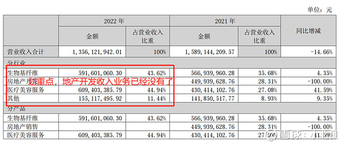 2021年7月,奥园美谷将其所持京汉置业100%股权、北京养嘉100%股权和蓬莱养老35%股权出售给公司旗下深圳市凯弦投资有限责任公司,交易标的作价10.2亿元。自此,奥园美谷完全脱离地产板块,主攻医学美容业务。2022年的财报可以看到,公司目前主要包含生物基纤维和医疗美容两大块业务。
