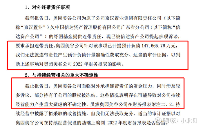 2021年,奥园美谷将京汉置业的股权转让,实现地产业务的剥离,随着三道红线、房住不炒政策的展开以及奥园集团的暴雷,奥园美谷的大股东作为关联方和担保方,被信达追偿陈年旧账——即之前京汉置业的连带责任担保。