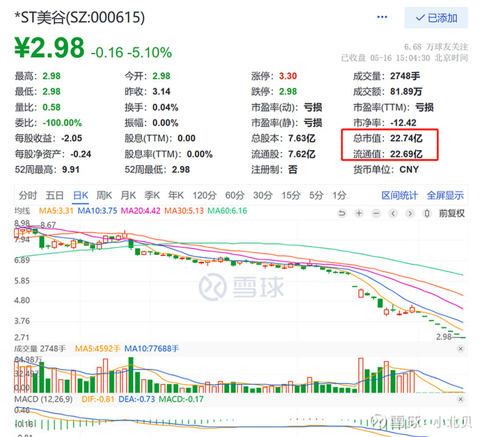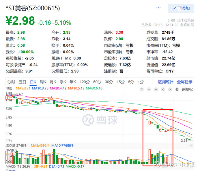 5月份,整个st板块的行情不好,很多突发性暴雷的st以及地产面退风险的st持续下跌,导致整个板块情绪不佳,踩踏严重,随着恐慌情绪的释放,除了几个面退风险极大的st以外,大部分基本面尚可的st都打开了连续跌停,进入到换手吸筹的阶段,这里有一个独特的存在,st美谷连续8个一字无量跌停,走出了退市一样的步伐,st美谷真的无药可救病入膏肓?st美谷有潜在的大雷还是有机构的阴谋?今天闲来和大家聊一聊美谷的那点事儿。$*ST美谷(SZ000615)$