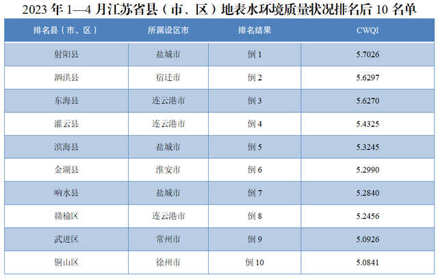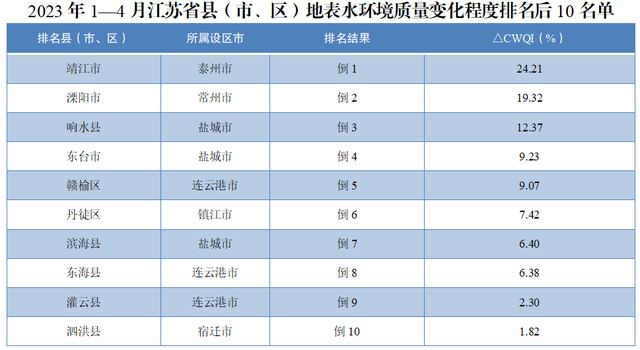 5月16日,江苏省生态环境厅发布了2023年1—4月江苏省县(市、区)地表水环境质量排名。