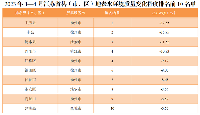 地表水环境质量改善幅度相对较快的前10位(1—10名)依次是宝应县、丰县、涟水县、丹阳市、江都区、铜山区、仪征市、淮安区、高邮市、建湖县。