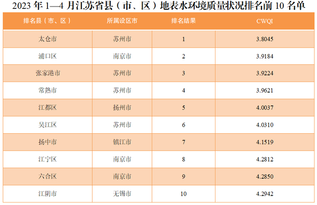 2023年1—4月,纳入高质量发展监测评价考核的63个县(市、区)中,地表水环境质量相对较好的前10位(1—10名)依次是太仓市、浦口区、张家港市、常熟市、江都区、吴江区、扬中市、江宁区、六合区、江阴市。