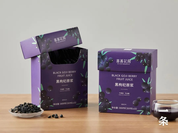 “喜善花房”黑枸杞原浆,现在一条生活馆有售▼