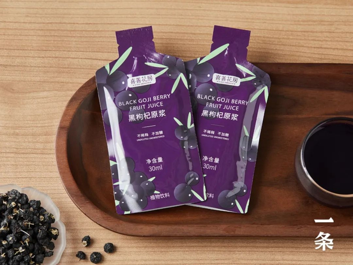 “喜善花房”新推出的这款黑枸杞原浆,不加一滴水,是一款可以直接饮用的饮品好物。