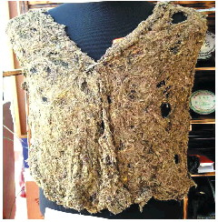 一套完整的蜘蛛衣,需要300多张蛛网才可以制成,包括帽子、上衣和裤子,它们整体呈现土黄色,手感轻盈,乍一看,面料与棉花有些相似。因为蛛网取下时,还残留着昆虫残壳和枯叶,轻轻触摸蜘蛛衣,会感觉轻微扎手,也许正是这些残留物,让蜘蛛衣散发出一股淡淡的药草味。