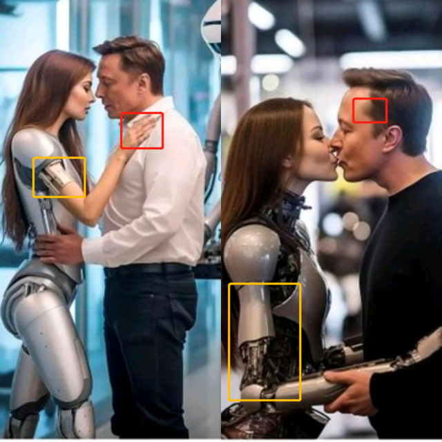两张图片中的机器人外形和结构存在明显差异。左图机器人的右手中指部分出现了分叉,右图“马斯克”的发际线旁则出现了不自然的阴影,这些都是AI生成图像的常见“异常”。