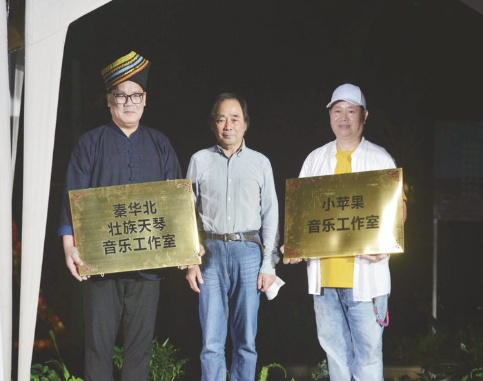 黄有异(中)为落地古岳坡的秦华北壮族天琴音乐工作室和小苹果音乐工作室授牌
