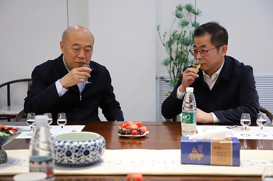 5月7日,汾阳杏花村。汾酒党委书记、董事长袁清茂与顾祥悦一行举行交流座谈,共话发展。