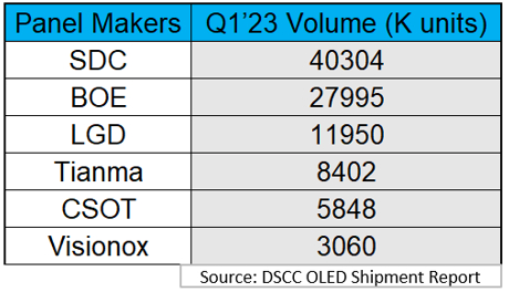 根据DSCC日前发布的数据,2023年第一季度,深天马智能手机柔性OLED面板出货约840万片,同比增长数倍,跃升成为中国第二大智能手机柔性OLED面板厂商,爆发力惊人。