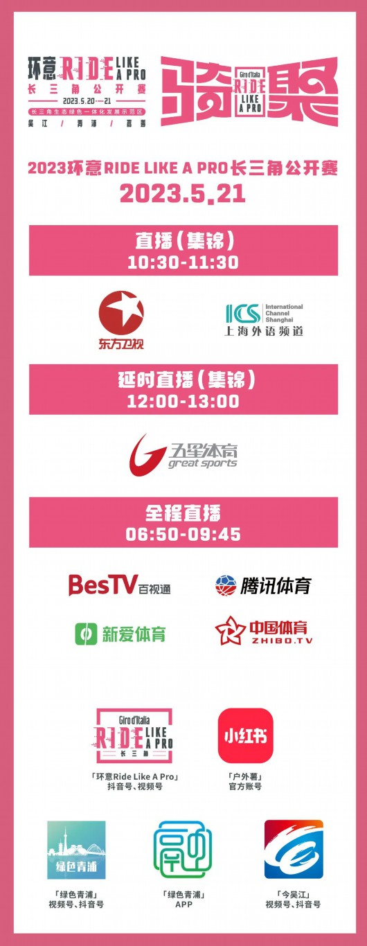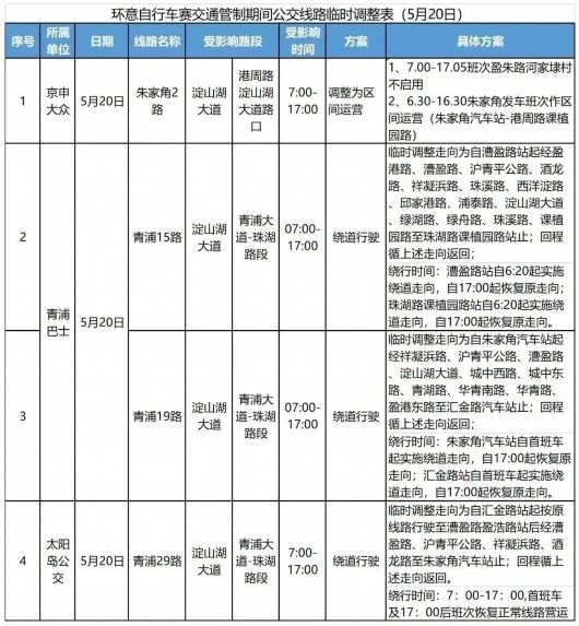 2023年环意RIDE LIKE A PRO长三角公开赛将于5月20日、5月21日在上海市青浦区举办。其中,5月20日举办绕圈赛;5月21日举办公路赛。为确保赛事的安全、顺利,根据《中华人民共和国道路交通安全法》《大型群众性活动安全管理条例》有关规定,对上海市青浦区部分道路实施交通管制措施和部分公交线路进行调整。现通告如下: