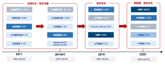 为了更好地适应国内汽车市场变化,拓普集团调整此前“合资为主,自主为辅”的策略,将精力放在吉利汽车等自主品牌,不断加大在台州、晋中、宝鸡等地的配套能力,紧密围绕吉利生产供货。