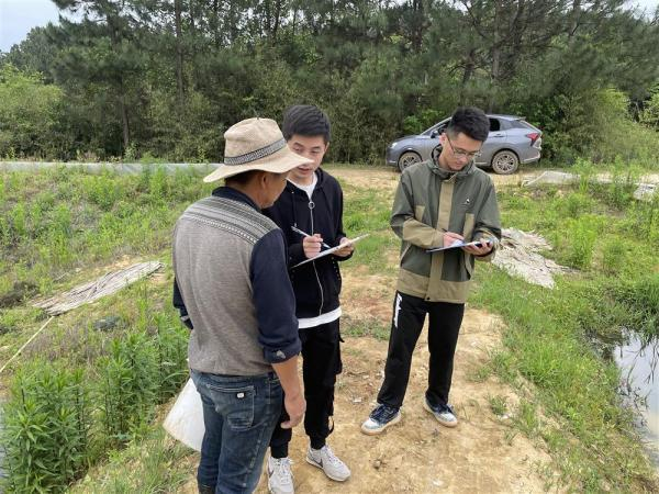 参与调查的安徽师范大学学生(右一、右二)向虾塘管理者咨询情况。