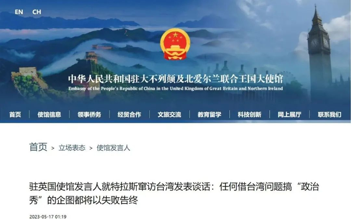 据中国驻英国大使馆17日消息,驻英国使馆发言人就特拉斯窜访台湾发表谈话:任何借台湾问题搞“政治秀”的企图都将以失败告终。