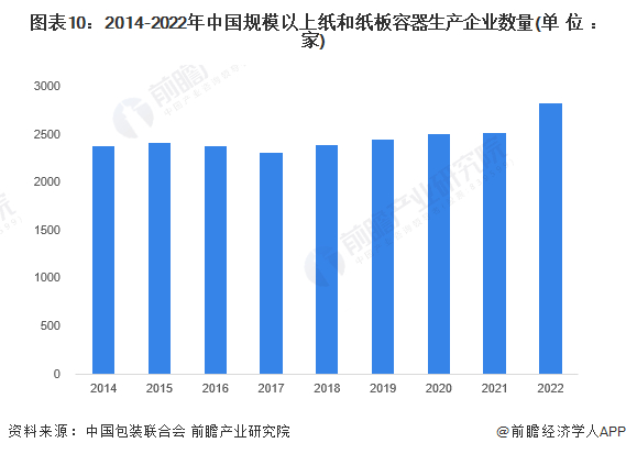根据中国包装联合会发布的《2022年纸和纸板容器行业运行情况》,我国纸和纸板容器行业规模以上企业共计2827家,较2021年增加310家。