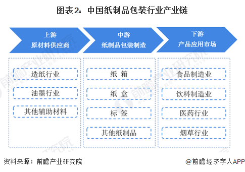 纸制品包装行业具有“上游窄,下游广”的特点,上游包括造纸行业、油墨行业和其他辅助材料行业,其中造纸行业是最主要的上游行业;下游行业众多,覆盖食品饮料、家用电器、消费电子、电商物流、机械器械、化工、日化、医药保健等行业。纸制品包装行业的上下游产业链如下图所示: