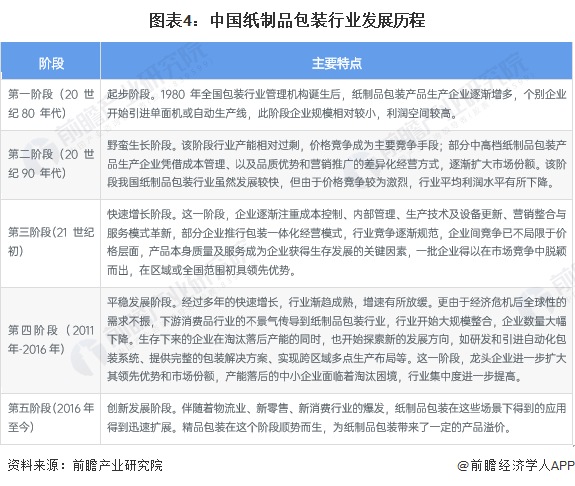 目前,我国纸制品包装行业已形成完整、合理的产业体系,改革开放以来的发展历程可概括为五个阶段:
