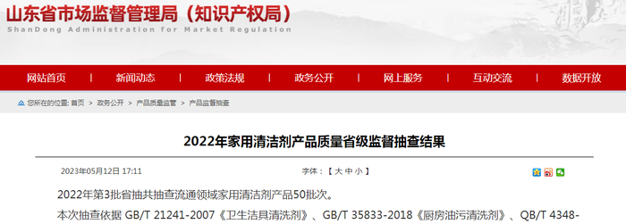 2022年山东省家用清洁剂产品质量省级监督抽查结果