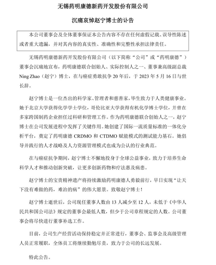 药明康德公告显示,赵宁博士是一位杰出的科学家、管理者和慈善家,毕生致力于人类健康事业。