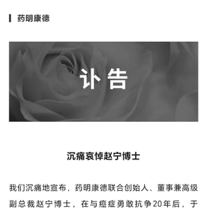 在与癌症抗争20年后,药明康德(603259)联合创始人赵宁辞世。5月17日早间,药明康德发布讣告沉痛宣布,公司联合创始人、董事兼高级副总裁赵宁博士,于5月16日与世长辞。