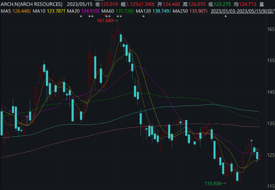 另一只Arch Resources股价波动就更为明显,3月一度涨至167.68美元/股的位置,但后来却出现大幅下跌。