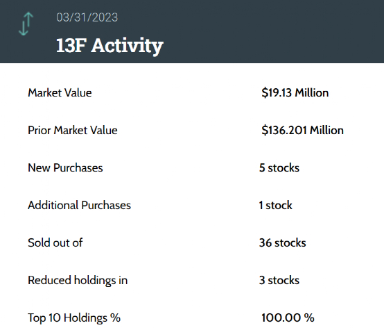根据美国证券交易委员会(SEC)最新披露的13F报告,王亚伟掌舵的对冲基金Top Ace Asset Management在2023年一季度末的美股持仓总市值仅有1913万美元,较去年底的1.36亿美元的持仓骤降近86%。
