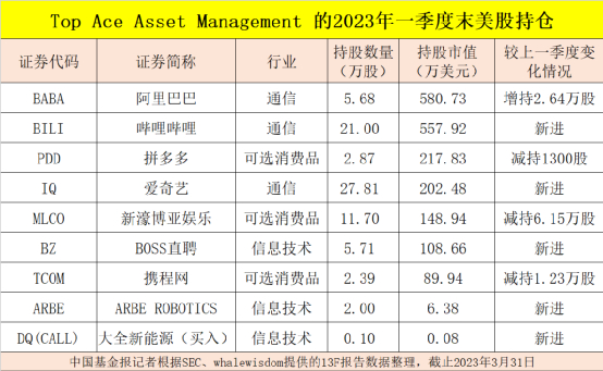 我们再来回顾一下王亚伟旗下Top Ace AM此前的布局,可以看到其在今年一季度的调仓情况。
