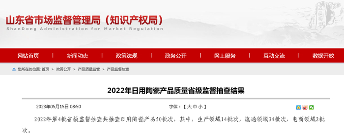 山东省市场监督管理局公布2022年日用陶瓷产品质量省级监督抽查结果