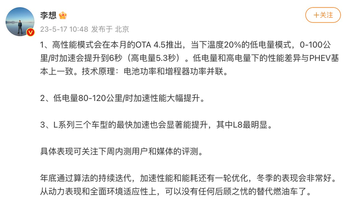 5月17日,理想汽车CEO李想在微博发文称,高性能模式会在本月的OTA 4.5推出,当下温度20%的低电量模式,0-100公里/时加速会提升到6秒(高电量5.3秒)。低电量和高电量下的性能差异与PHEV基本上一致。低电量80-120公里/时加速性能大幅提升。L系列三个车型的最快加速也会显著能提升,其中L8最明显。