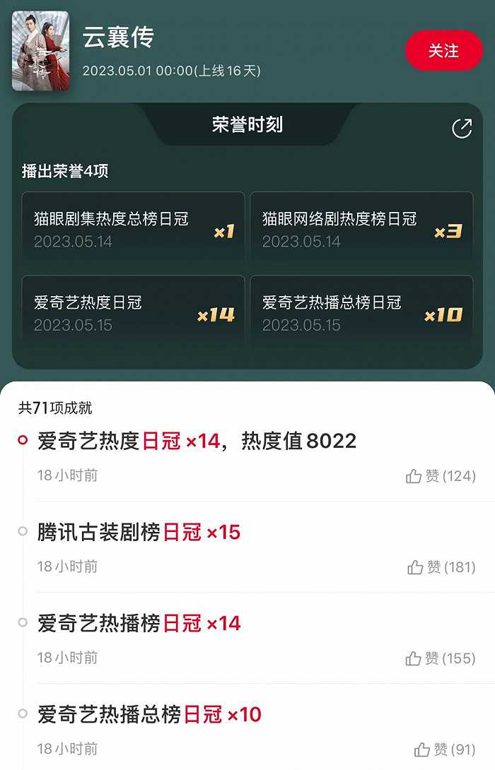 光看播放数据,《云襄传》好像挺火的。播出16天拿下了爱奇艺热度日冠14次,腾讯视频古装剧榜热冠15次,几乎相当于天天上榜了。