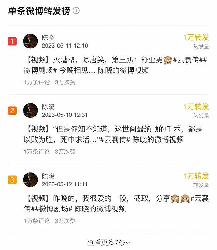 不过,《云襄传》的微博超话讨论量仅有685.7万,三条过万的转发微博全部由陈晓一人贡献,完全可以视为粉丝发电。其官方抖音账号的累计点赞量仅604.1万,估计收官也难破千万大关。以4月爆剧《长月烬明》为参考,其官抖在剧集收官时点赞量已破8000万。