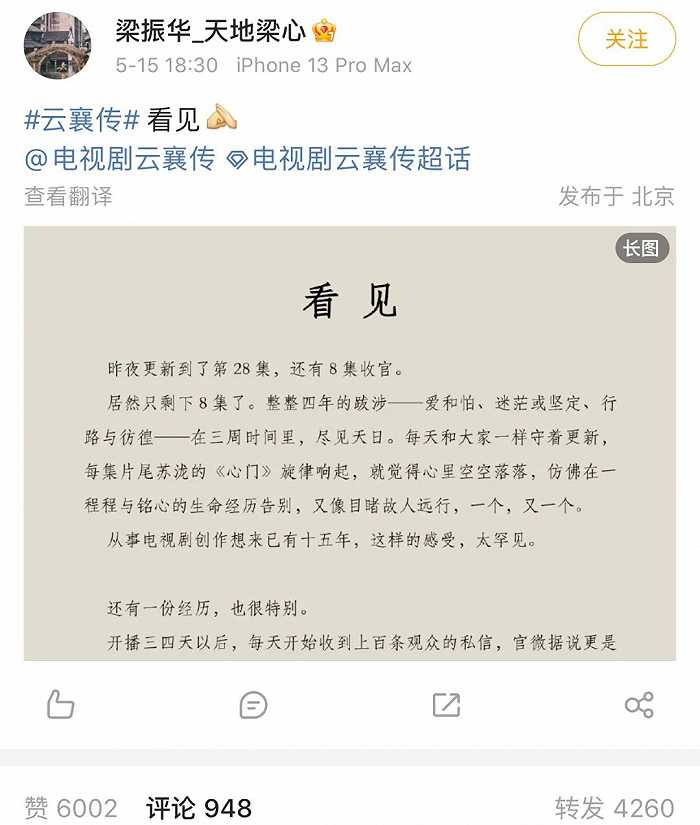 5月15日,《云襄传》制片人兼编剧梁振华在微博发出小作文,算是彻底给前一个问题盖棺定论。“每一部作品的命运,当真是一门‘玄学’。宣传团队不可谓不尽心不努力,策略打法几经调适,人力财力亦投入不菲,但的确还没有唤来更大的‘路人盘’。”