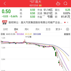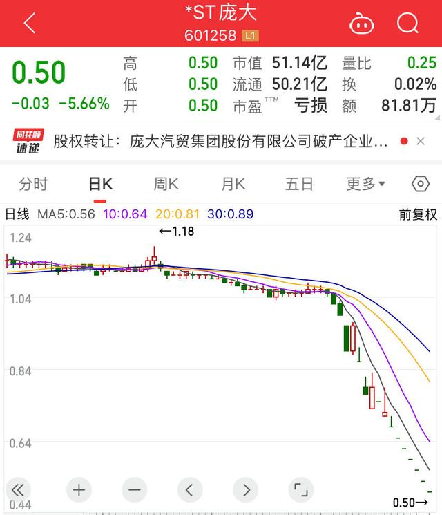 曾经的“汽车经销商第一股”庞大集团(601258.SH),在经历破产重整后仍未挽回颓势,即将告别A股。截至今日午间收盘,*ST庞大跌停,收报于0.50元/股。