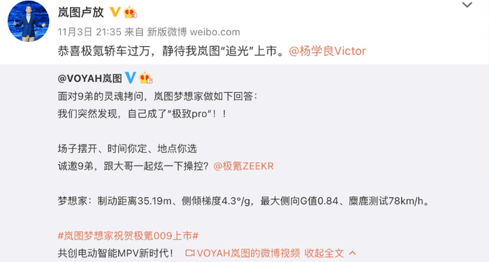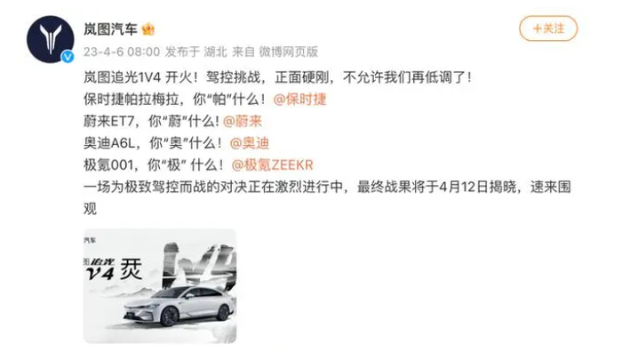 另外一个被大家定义为“碰瓷式营销”案例是在2023年4月,岚图汽车意在宣传其第三款新车“追光”。这次岚图追光的营销文案中语气略显挑衅,还@了保时捷、蔚来、奥迪、极氪在内的四家车企官号。但岚图汽车等来的不是任何一家车企的回应,而是网友的吐槽,甚至有人认为在品牌力不足的情况下,如此“叫嚣”保时捷等知名品牌,实在是自不量力,不明白岚图在“图什么”。