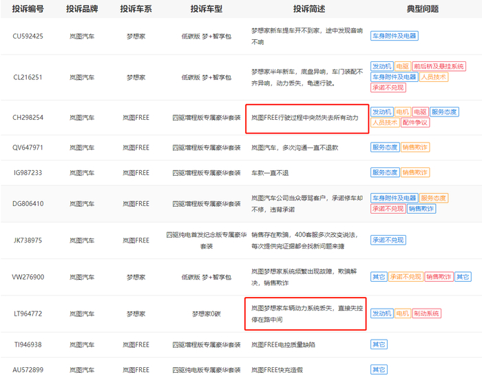 产品的优势如若不明显,车企可能会更加卖力地维系用户口碑,提升销售能力和售后服务质量。但岚图汽车却存在影响用户口碑的产品质量问题,中国网汽车投诉平台也收到了岚图汽车用户的多条实名投诉。这些投诉与之前网上用户抱怨的岚图FREE增程版车型油耗高、纯电动车型电池寿命衰减等问题有所区别,最为严重的故障问题为“行驶过程中失去动力”。