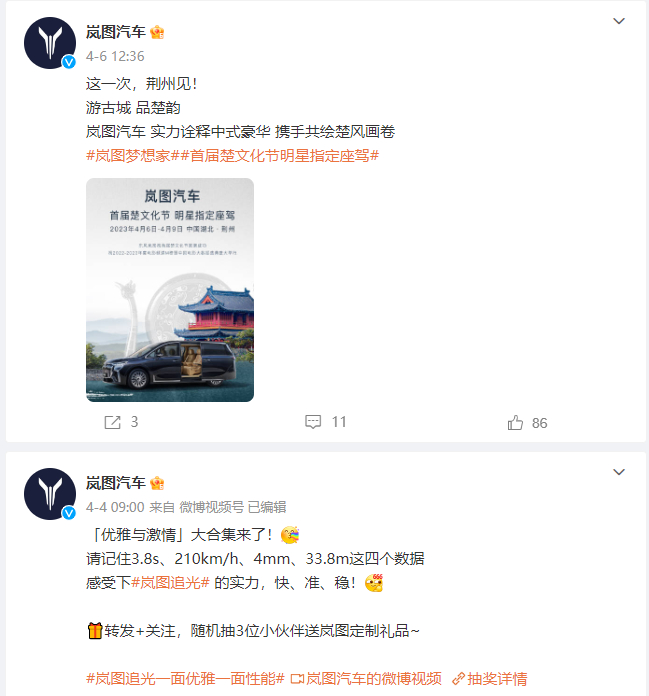 这次营销案例是对是错,我们不用主动下定论,岚图汽车官方账号上的这条信息已经看不到了,取而代之的是“游古城,诠释中式豪华”的营销图文。由此可见,岚图汽车的产品营销节点和定调有些不够坚定,对于性能营销和国风文化营销都在一个时间节点。
