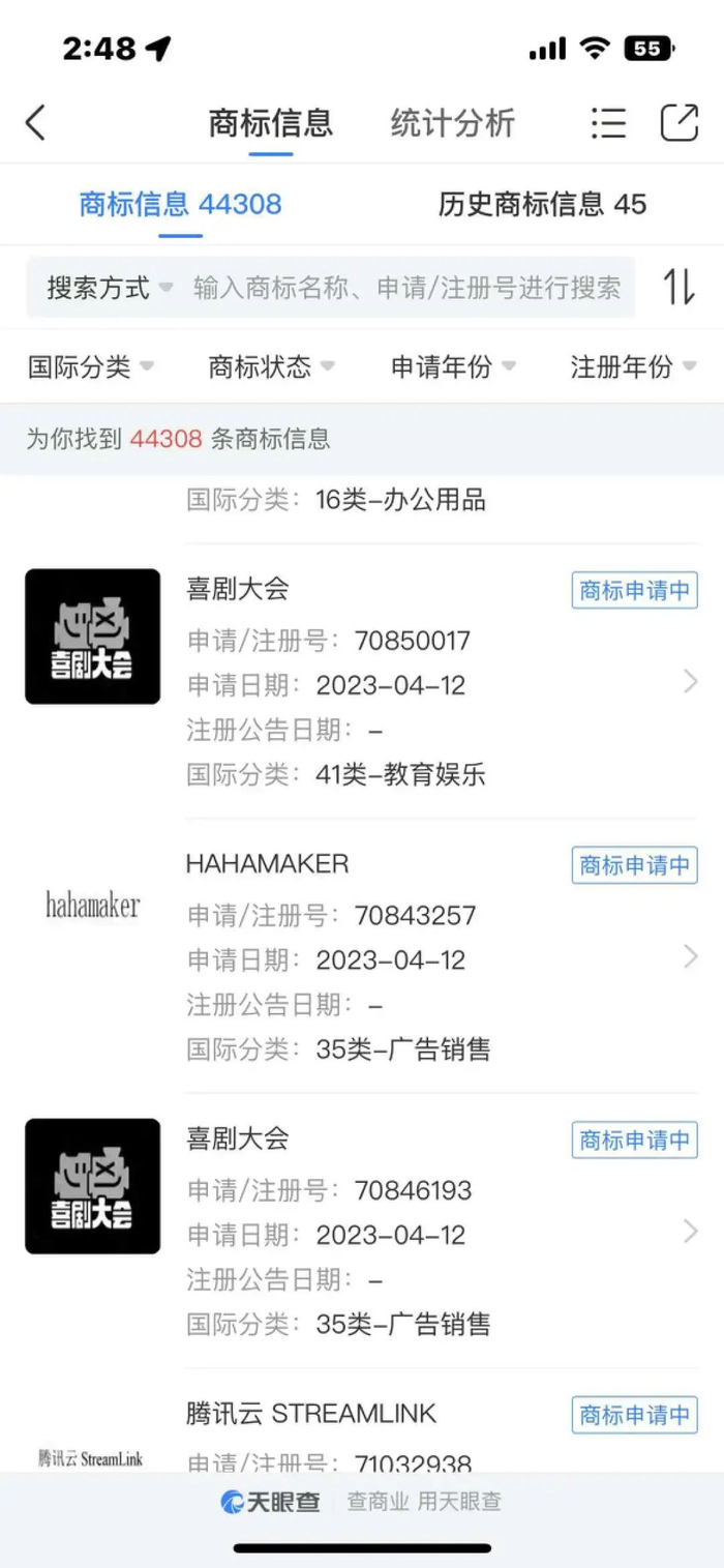 除了每年常规的《脱口秀大会》与《吐槽大会》,2023年笑果文化计划推出全新喜剧类综艺节目《喜剧大会》。天眼查APP显示,腾讯科技(深圳)有限公司申请注册一枚“喜剧大会”图形商标,国际分类为教育娱乐,当前商标状态为申请中。