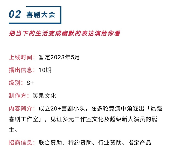 根据网传招商信息,该节目为S+综艺节目。蓝鲸记者查询发现,目前该节目已开通官方微博,而笑果文化创始人、董事长叶烽在前不久的“石库门与创新文化”青年创业论坛上公开表示,该节目将于月底(5月)上线。