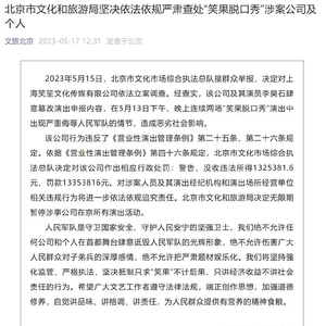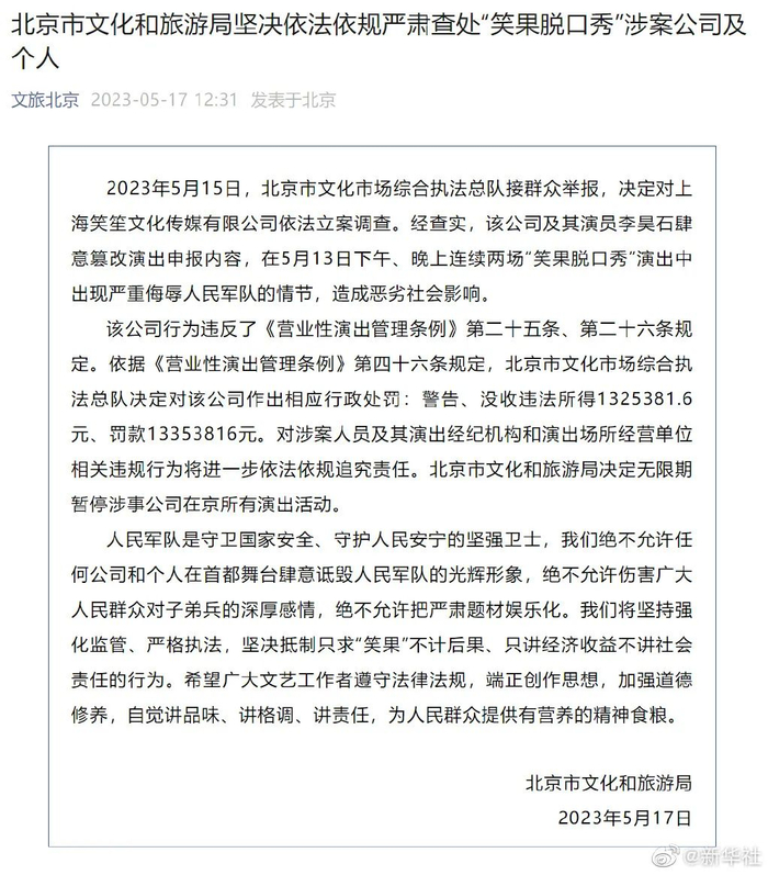 2023年5月15日,北京市文化市场综合执法总队接群众举报,决定对上海笑笙文化传媒有限公司依法立案调查。经查实,该公司及其演员李昊石肆意篡改演出申报内容,在5月13日下午、晚上连续两场“笑果脱口秀”演出中出现严重侮辱人民军队的情节,造成恶劣社会影响。