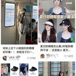 在抖音、小红书等社交媒体上的防晒帽穿搭、硬防晒攻略中,这款宣称“不会影响发型、显高颅顶,可‘全脸防晒’”的大檐空顶帽,成了出镜率极高的“必备神器”、集美们出街人手一顶的时尚新宠。