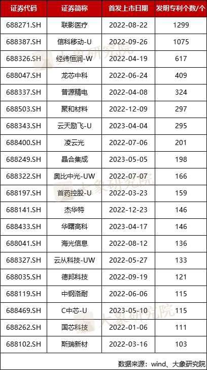以下是2022-2023年科创板上市企业中发明专利数量最高的20家企业: